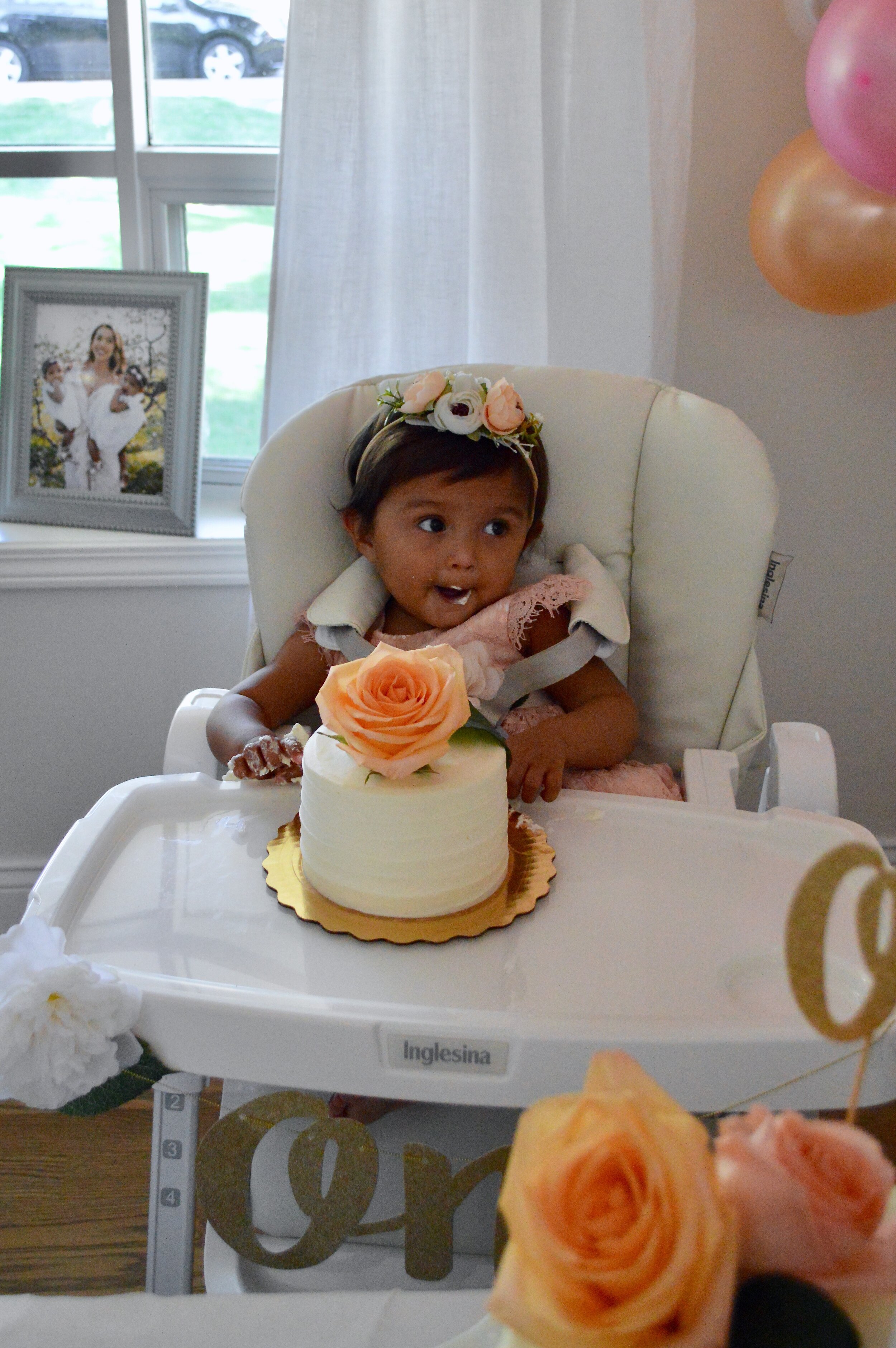 We ordered smaller versions of the berry Chantilly cake so the girls could each have their own to “smash”. I absolutely love the salmon shade of the roses I placed on top! Fresh flowers are such an easy & relatively inexpensive way to decorate cakes. Also, how stunning are the peachy pink roses some of our dear family friends got for the girls? They almost look like peonies with the ruffle edged petals 😍. Does anyone know what type of roses these are? I would love to get some more!